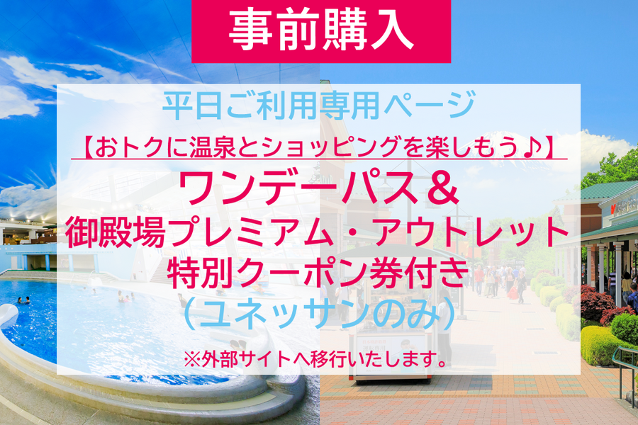 【前売券・平日ご利用専用】ワンデーパス&御殿場プレミアム・アウトレット特別クーポン券付き ユネッサン(水着エリア)のみ