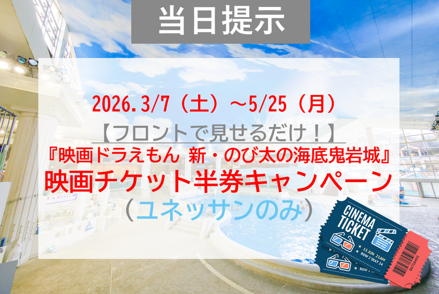 『映画ドラえもん 新・のび太の海底鬼岩城』の映画チケットの半券・二次元バーコードチケット画面・チケット購入画面のいずれかを受付でご提示いただくと、通常価格から最大500円割引でご利用いただけます!