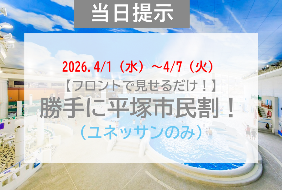 期間中、平塚市民のお客様はユネッサン(水着エリア)がお得に!